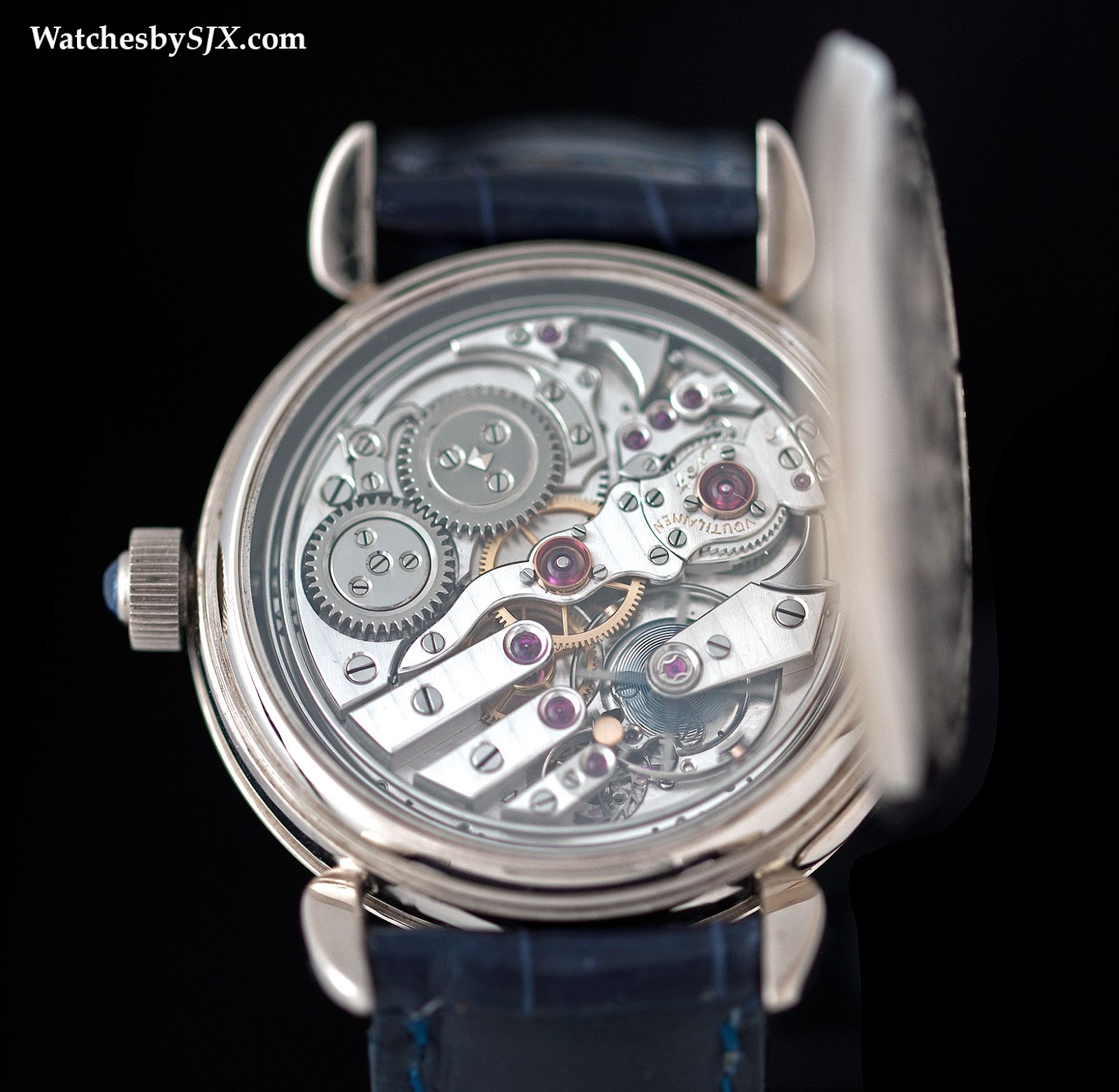Cette version est livrée dans un étui en or rose. Les dimensions des boîtiers sont inchangées avec une largeur de 47 mm et une épaisseur de 16,55 mm. L'affaire est conçue spécialement et les pattes doucement courbées signifient qu'il sera même bien adapté aux poignets plus minces. Cela contribue également à ce que la courroie d'alligator marron soit si bien faite, ce qui n'est peut-être pas nécessaire d'être clarifié avec une montre qui coûte environ un quart de million de dollars. La finition du boîtier est également de première qualité, avec des surfaces parfaitement polies et des lignes bien définies. Une autre caractéristique remarquable de l'affaire est la couronne perlée, également rendue en or rose 18 carats, et réglée avec un cabochon saphir bleu.