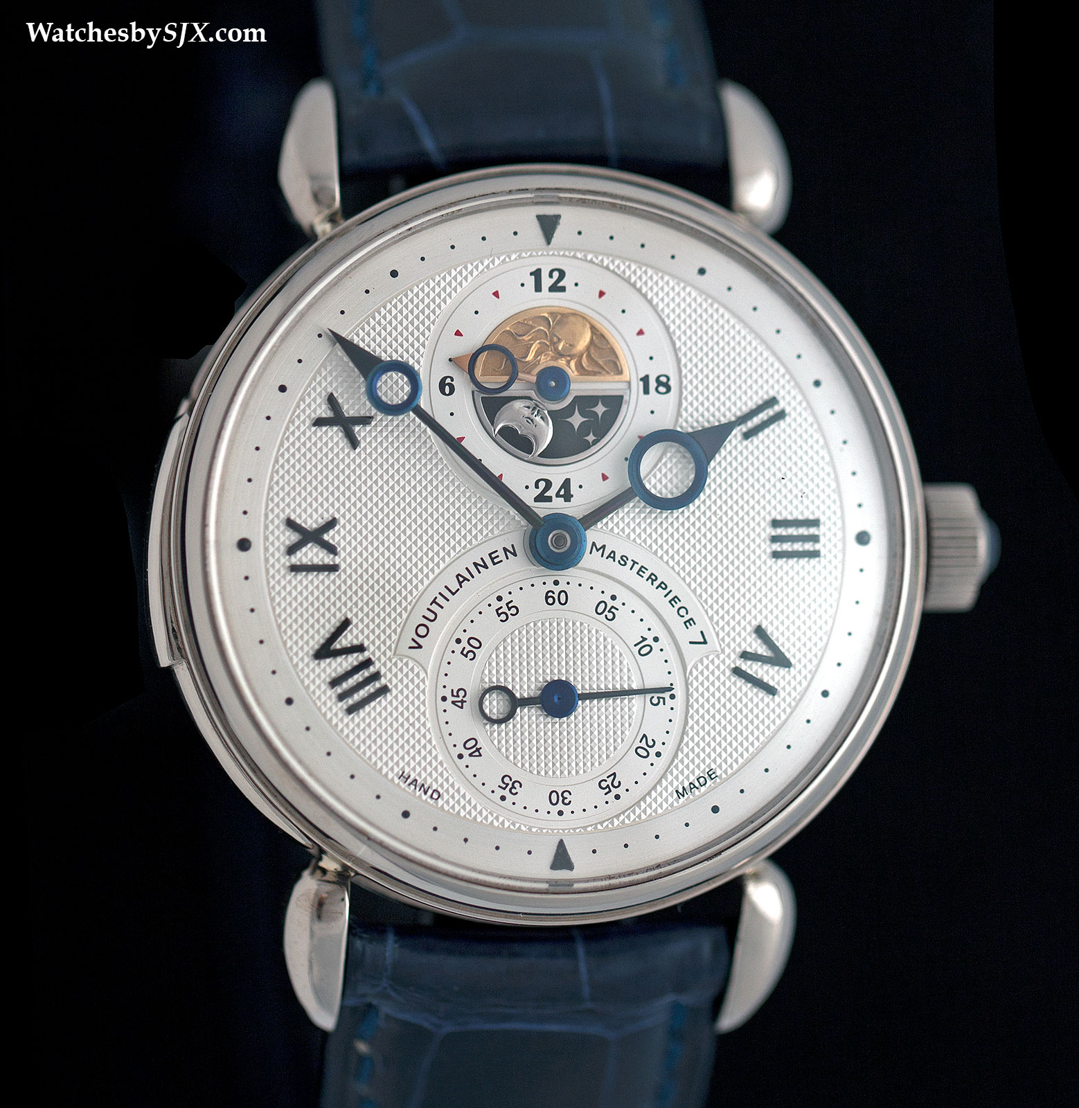 Le premier disque de météorite à la partie supérieure de la molette forme le sous-dial pour indiquer l'heure. Le temps est dit simplement en lisant les deux mains en acier bleues qui pointent vers de grands chiffres romains squelettisés qui sont formés en utilisant un or blanc 18 carrés à la périphérie du cadran. Regardez attentivement et vous remarquerez un anneau de 24 heures autour de la sous-cadran. C'est pour dire le temps dans un autre fuseau horaire et peut être réglé indépendamment simplement en utilisant le poussoir à 2 heures. Cela rend le Cartier Rotonde de Cartier Earth et Moon Tourbillon très pratique pour les voyageurs fréquents.